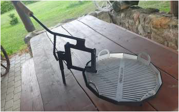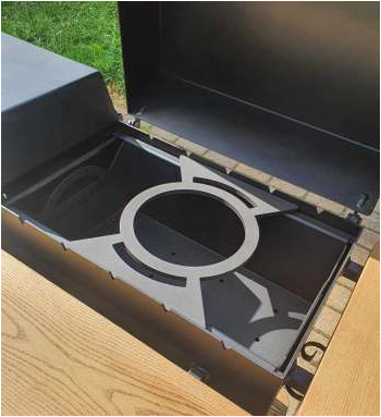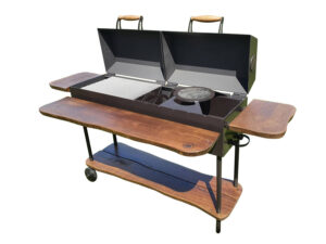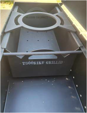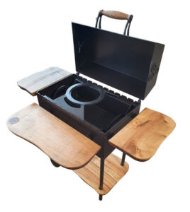 Lujarakenteinen hiiligrilli kahdella hiililaatikolla. Grillin runko on 4mm terästä ja kannet 3mm terästä. Puuosat saarnea ja tammea.