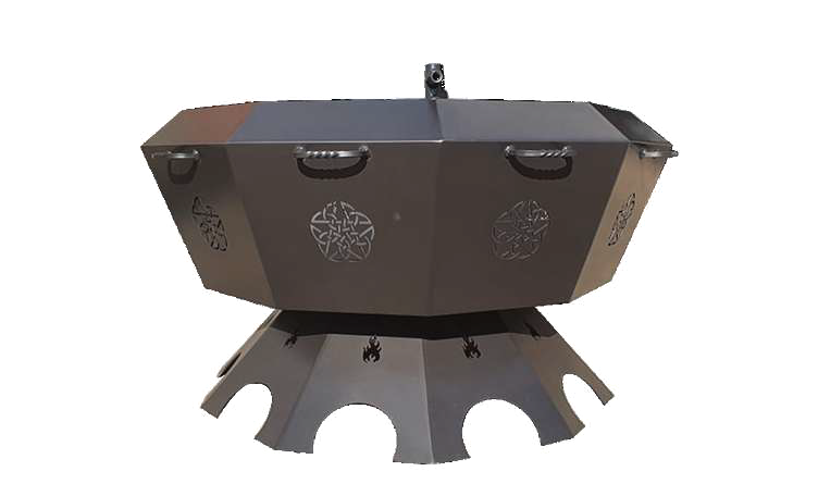 8-kulmainen tulipesä-malli. Tulipesän mitat ovat: 800x800mm ja korkeus 500mm. Tulipesän materiaali on 4mm paksua terästä, pohja on 5mm terästä.
