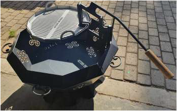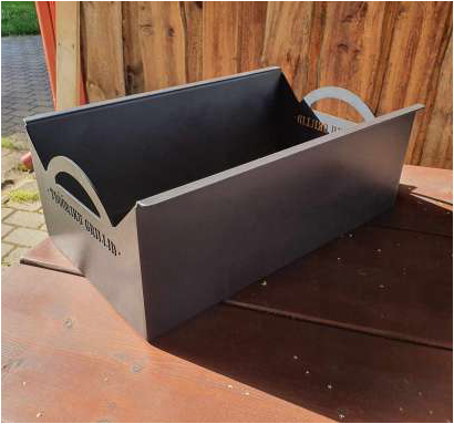Timantin mallinen tulipesä. Tulipesän mitat ovat: halkaisija 960mm ja korkeus 500mm. Tulipesän materiaali on 4mm paksua terästä, pohja on 5mm terästä.